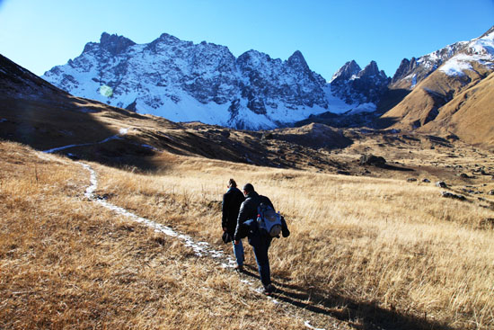 We start climbing on the 2200 m above sea level, to the Chaukhi pass ( 3300 m) , visit the lakes Abudealuri and following down to Roshka Village ( 2000 m )
